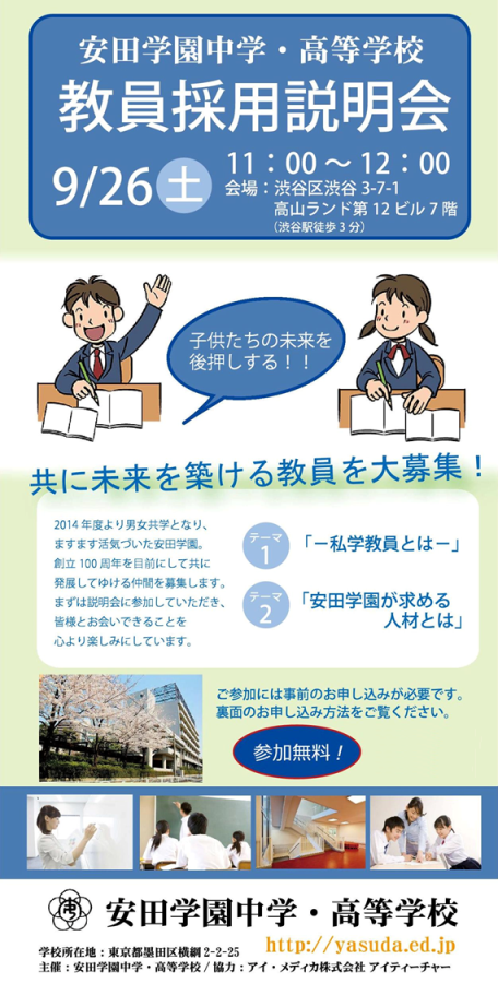 9/26(土)11:00、「安田学園中学・高等学校」教員採用説明会に参加を希望される方は下記フォームよりお申込みください。※概要は右画像クリックして拡大
